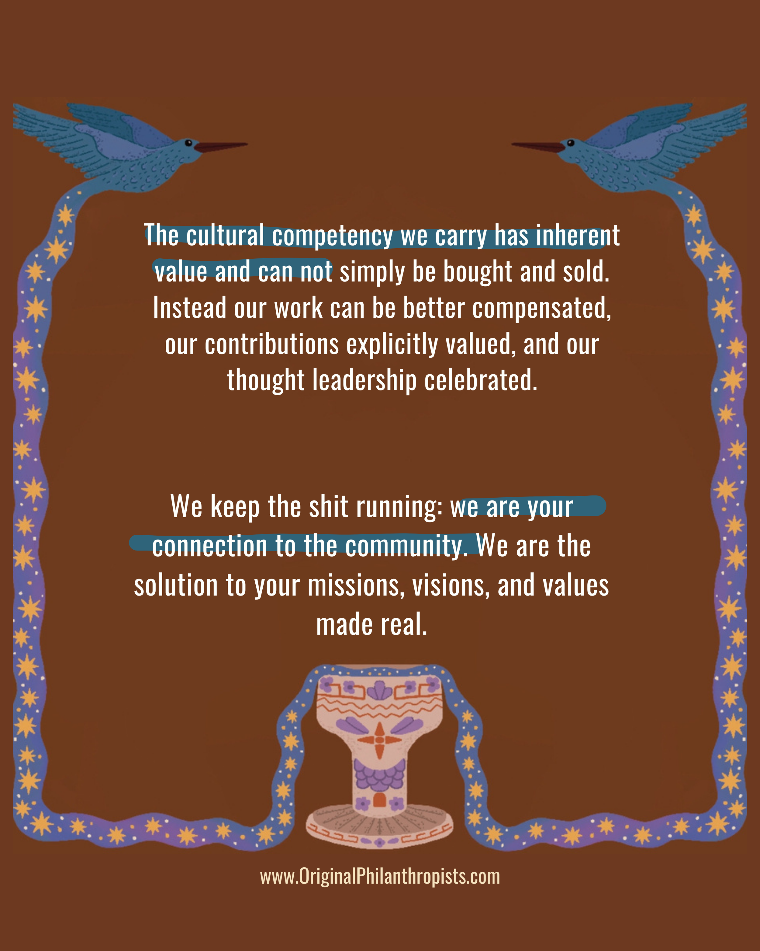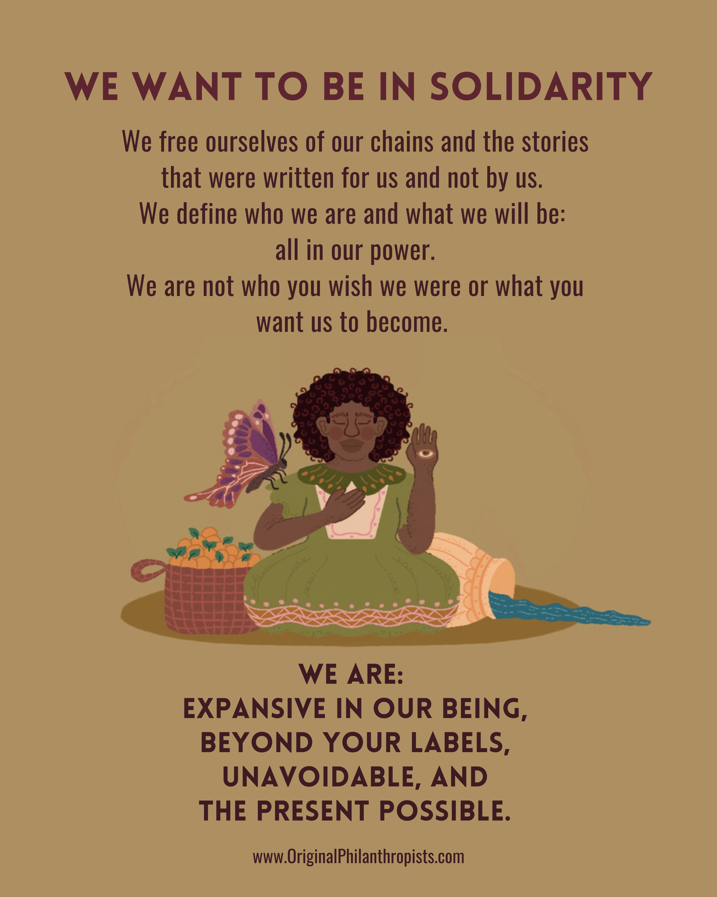 Authors: Aaron Cano, Evelyn Barahona, Adriana Garcia Avendaño, Jenna O'Brien, Alexis Newtown, Joanna Carrasco, Joel Hernandez, Anna Gomez, Karla Moreno, Ausannette Garcia-Goyette, Laura Vergara, Camila Navarrette, Maritza Bandera, Chloe Silva, Monica Cruz, Cynthia Sanchez, Natalia Siegel, Denise Nava, Dennis Gonzalez, Emilia Carrara, and Thomas Vasquez. Some authors have opted for anonymity, acknowledging the philanthropic sector's inadequate support for our safety and well-being, along with its consistent efforts to suppress - through retaliation and backlash- our strategies to hold it accountable.
